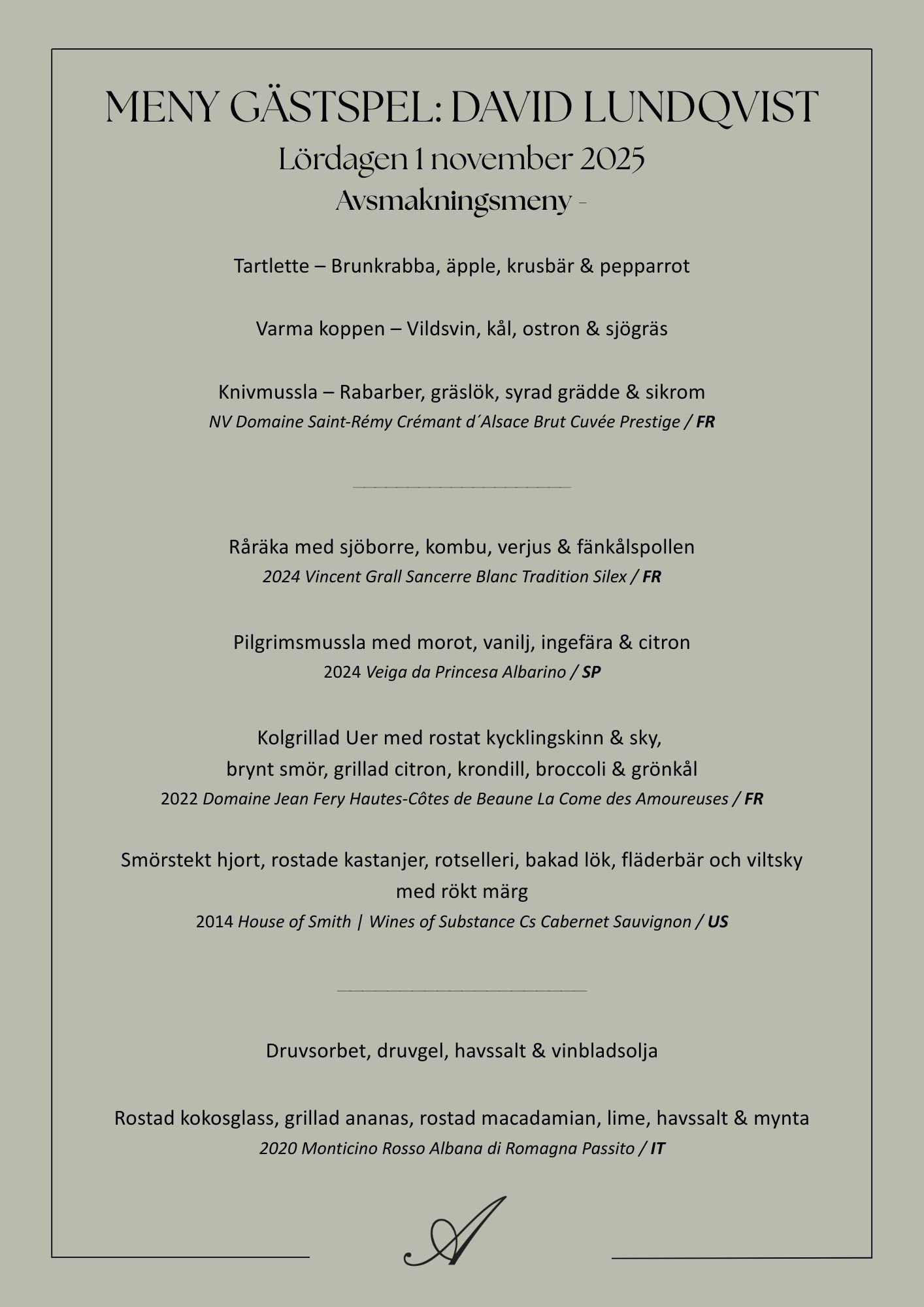 Vi bjuder in till en unik kväll där David presenterar en 5-rätters meny som serveras tillsammans med viner utvalda av vår egen Anna Röjerman.