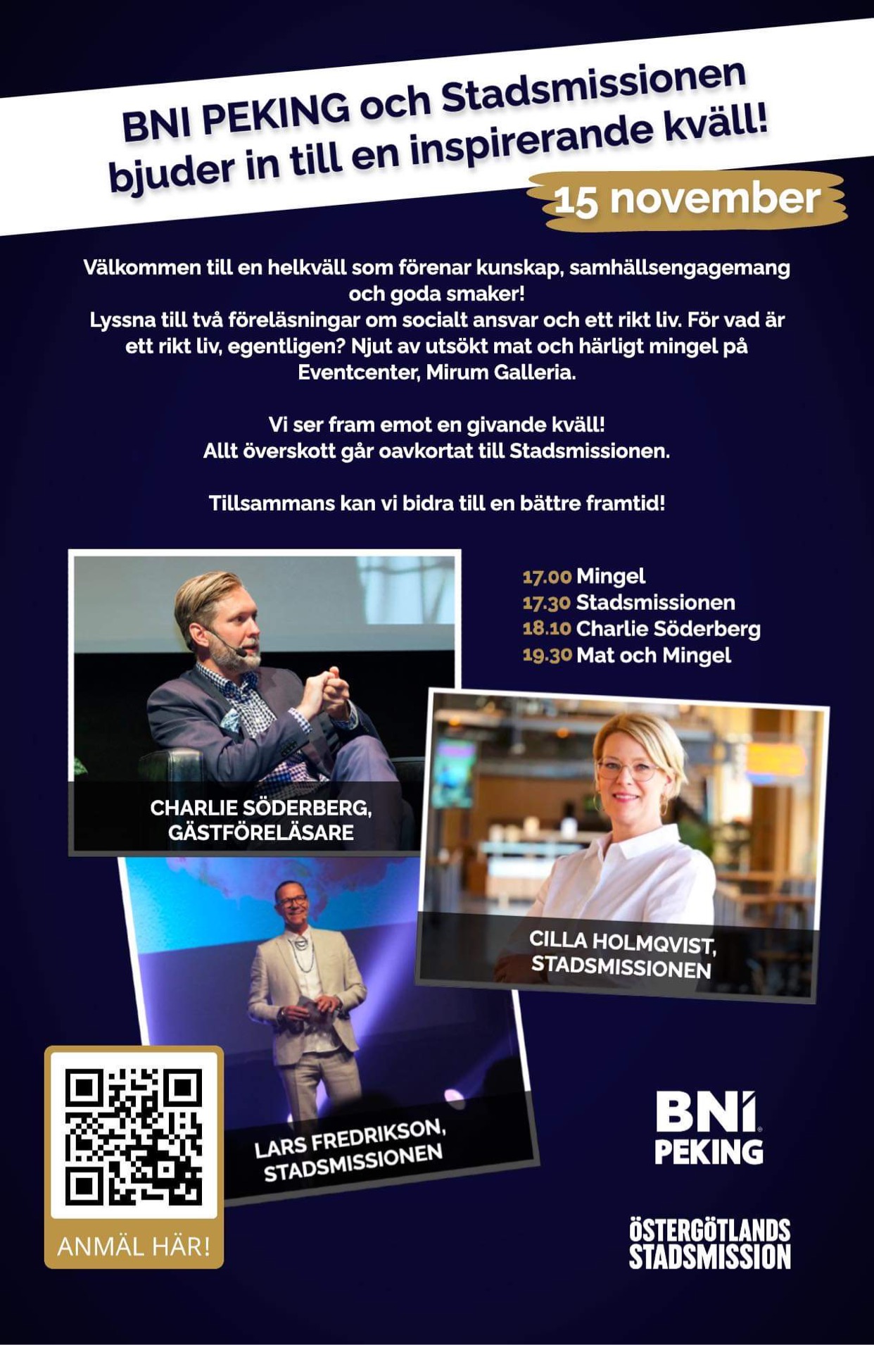 Lyssna till två föreläsningar om socialt ansvar och ett rikt liv. Njut av god mat och härligt mingel på Eventcenter, Mirum Galleria.