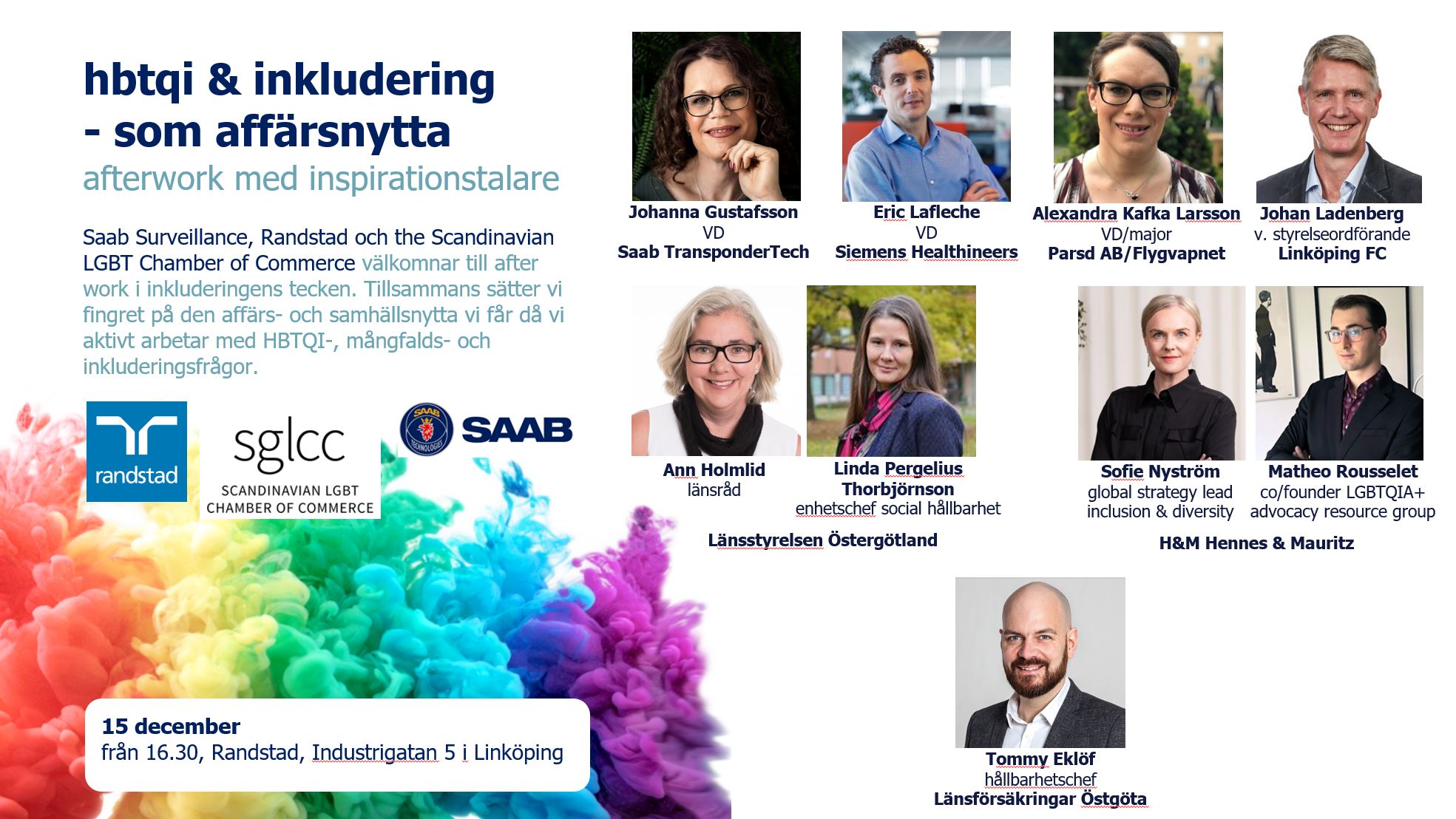 Tillsammans med Saab Surveillance och Scandinavian LGBT Chamber of Commerce (SGLCC) hälsar vi er välkomna till en afterwork i inkluderingens tecken! Kom och träffa och lyssna till Johanna Gustafsson på Saab TransponderTech, Sofie Nyström och Matheo Rousselet på H&M, Alexandra Kafka Larsson på Parsd / Swedish Armed Forces, Ann Holmlid och Linda Pergelius Thorbjörnson på Länsstyrelsen Östergötland, Eric LaFleche på Siemens Healthineers, Johan Ladenberg på Linköping FC och Tommy Eklöf på Länsförsäkringar Östgöta. Tillsammans sätter vi fingret på den affärs- och samhällsnytta vi får då vi aktivt arbetar med HBTQI-, mångfalds- och inkluderingsfrågor.