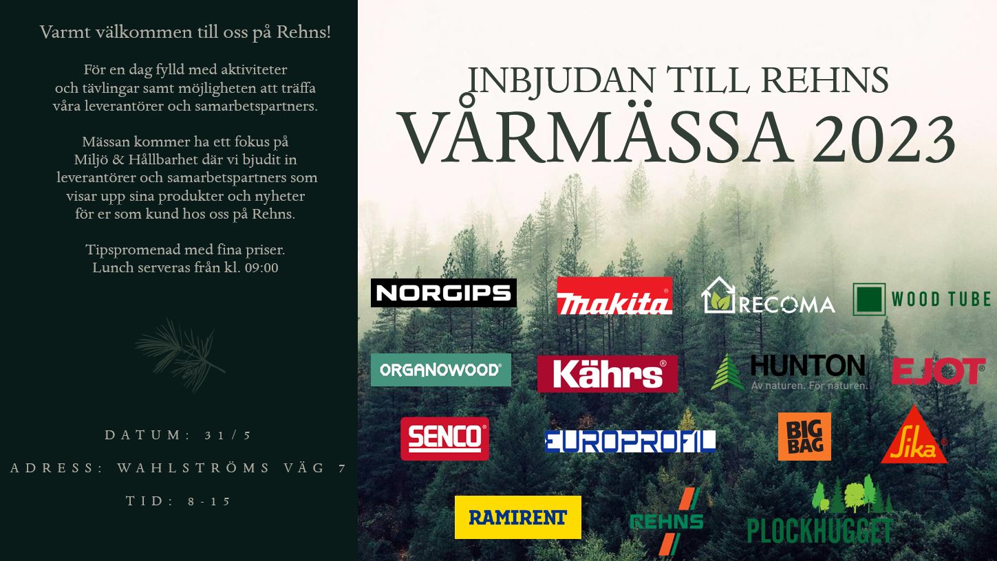 Nyköping är en stad med fokus på Miljö & Hållbarhet. Därför anordnar vi på Rehns en mässa den 31/5 med fokus på områdena kring Miljö & Hållbarhet där vi har bjudit in våra leverantörer och samarbetspartners som visar upp sina nyheter och satsningar för ett grönare byggande.