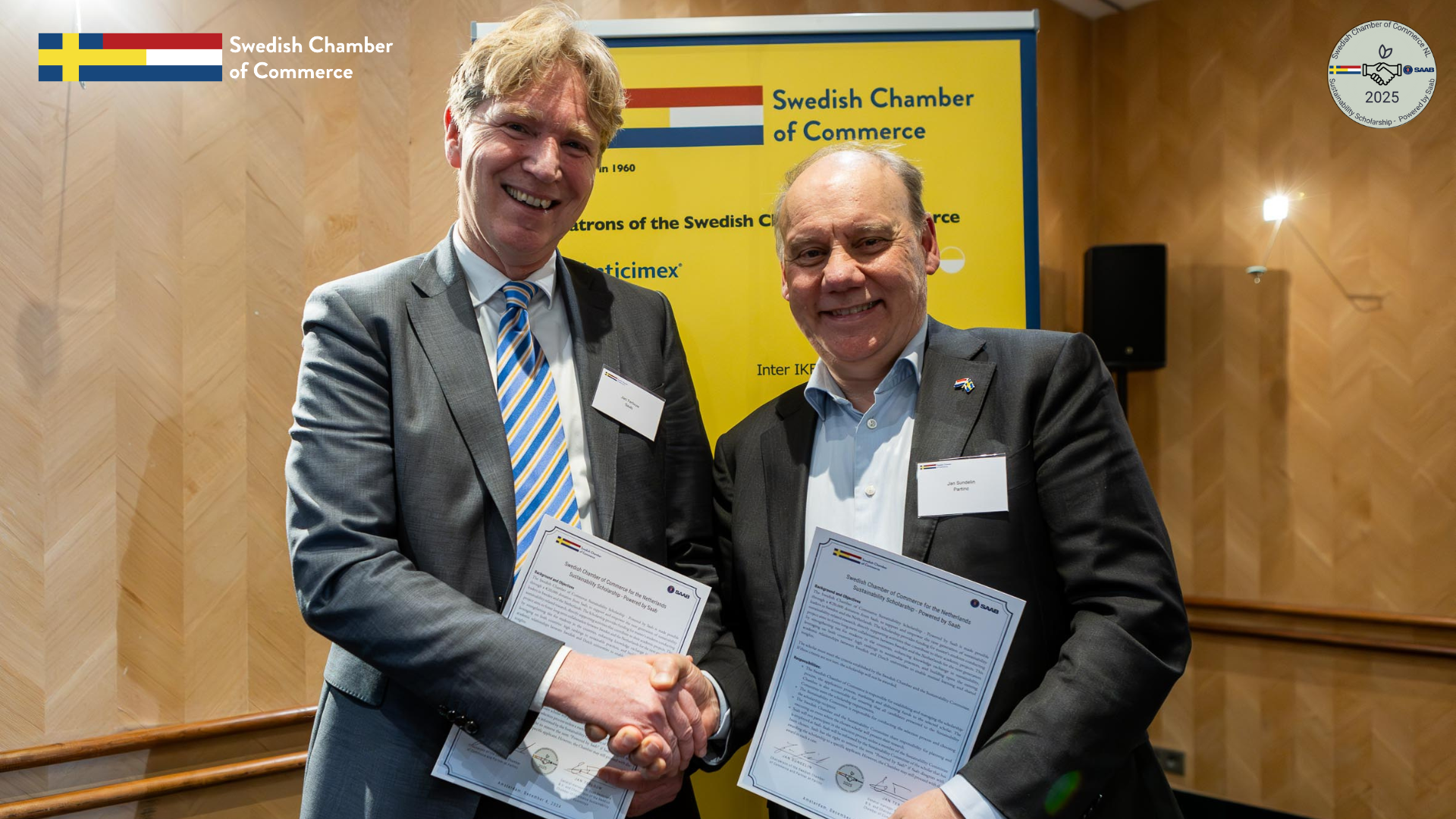 Amsterdam, 6 december 2024 – Svenska Handelskammaren i Nederländerna, i samarbete med Saab Nederland, presenterar stolt lanseringen av Swedish Chamber of Commerce for the Netherlands Sustainability Scholarship – Powered by Saab. Tillkännagivandet gjordes under handelskammarens flaggskeppsevenemang, Sustainability & Innovation Summit: AI Driving the Sustainable Transformation, som hölls i Amsterdam den 6 december 2024. Partnerskapet mellan Svenska Handelskammaren i Nederländerna och Saab formaliserades genom undertecknandet av ett samarbetsavtal vid evenemanget. Detta stipendium understryker ett gemensamt engagemang för att främja akademisk excellens och utveckla hållbarhetsinitiativ mellan Sverige och Nederländerna.