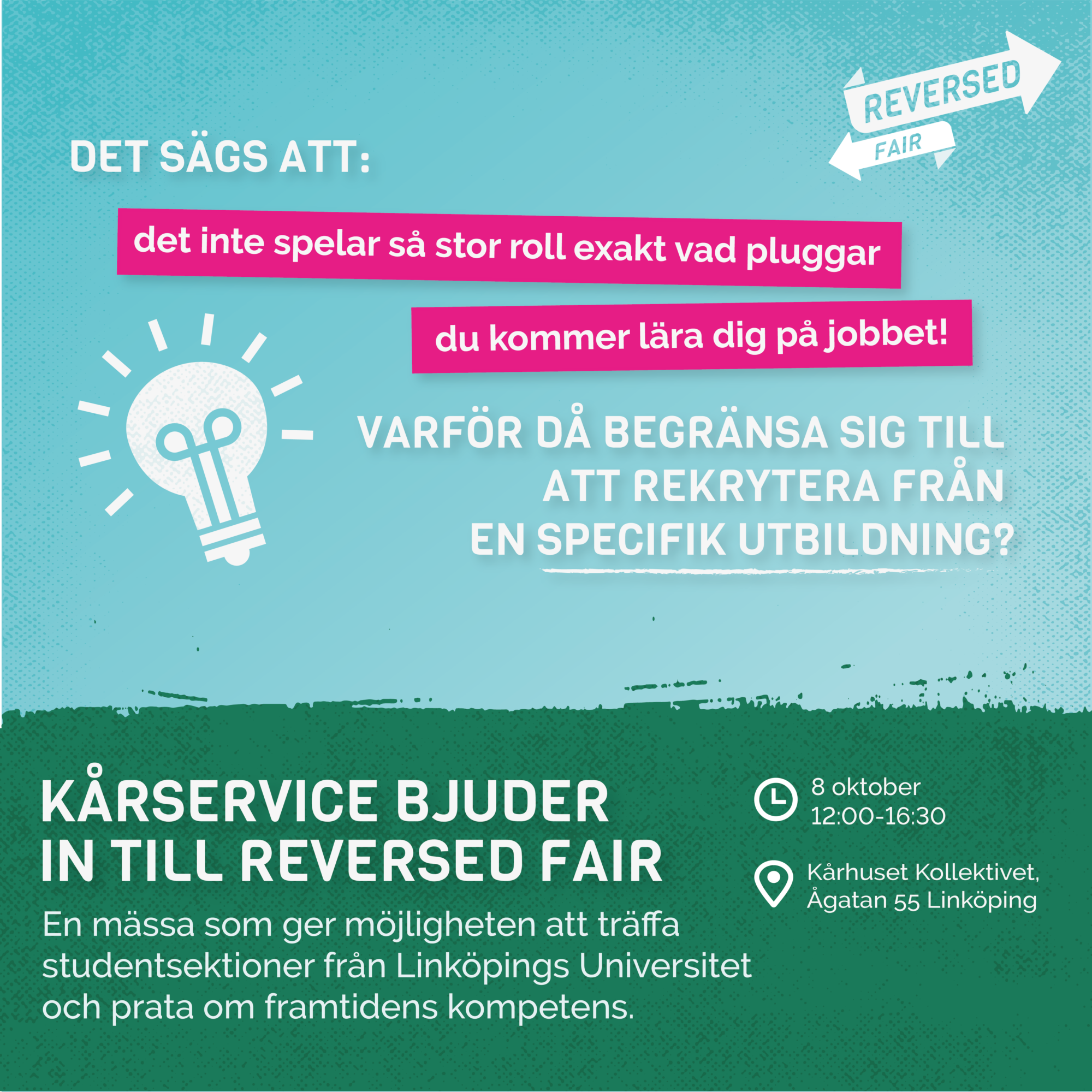 Att förstå vad alla 37 000 studenter vid Linköpings universitet får med sig i termer av kompetens och förmågor är inte det lättaste. Kårservice som är i hjärtat av studentlivet bjuder in till en halvdag där representanter från sektioner pitchar sin kompetens och visar på bredden bortom traditionella etiketter. Vi hoppas att du som arbetsgivare, rekryterande chef eller verksam inom HR vill inspireras av framtidens kompetens och hitta vägar till nya samarbeten.