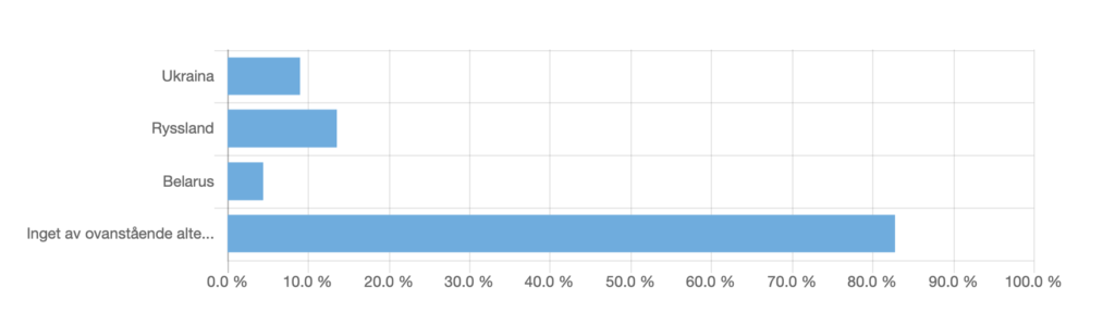 Bland de drygt 110 svarande angav knappt 20 procent av företagen att de har direkt relation med/eller verksamhet i Ukraina, Ryssland och/eller Belarus. Det handlar oftast om leverantörer, kunder eller att man har personal på plats.
