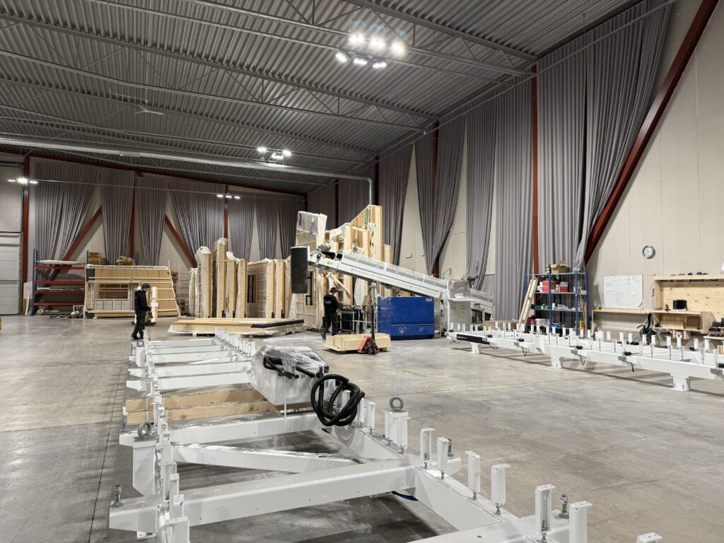 Under besöket fick vi se färdiga väggmoduler till ett LSS-boende som är klara för leverans. Målet är att ta fram ett typhus som kan fungera som grund – där Evia bygger modulväggar som är effektiva att producera och lätta att transportera.